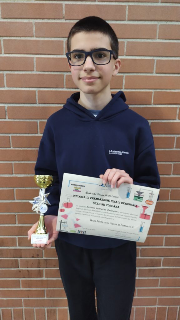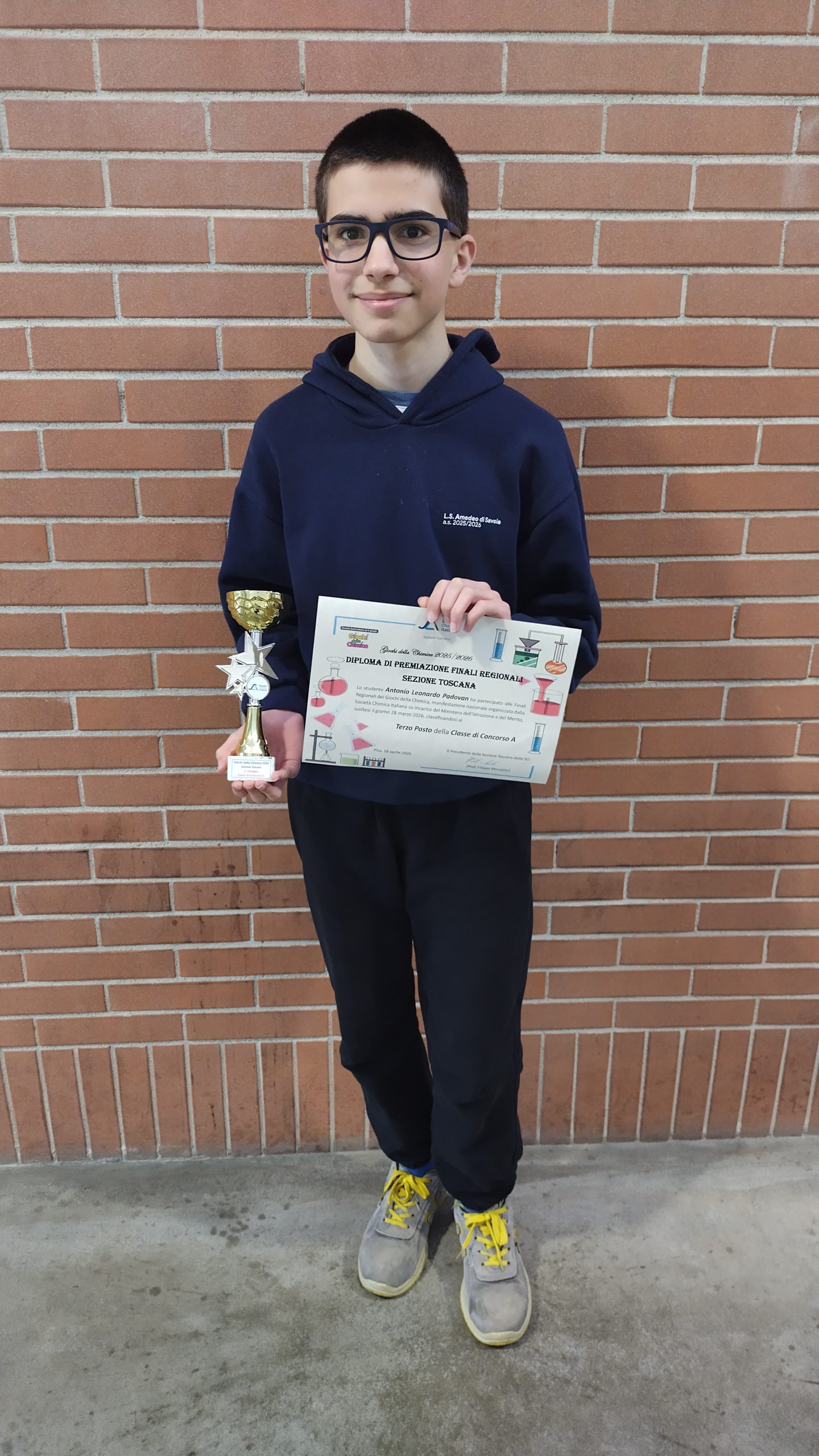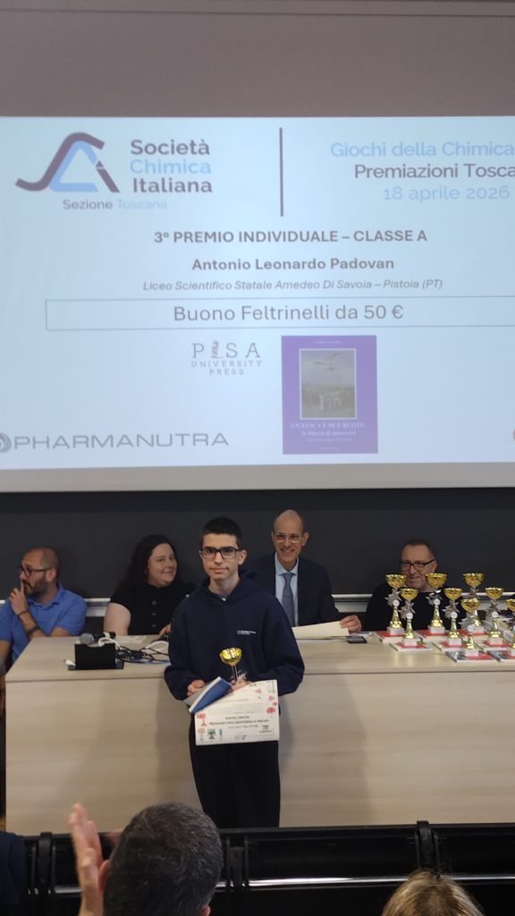 Leonardo Antonio Padovan premiato sabato 18 a Pisa terzo classificato alla gara del biennio dei Giochi della chimica in Toscana. (64 esimo su 1302 a livello nazionale).